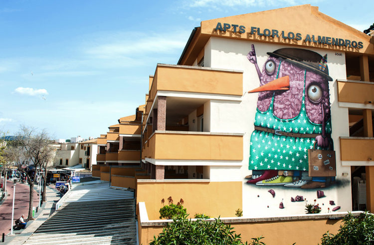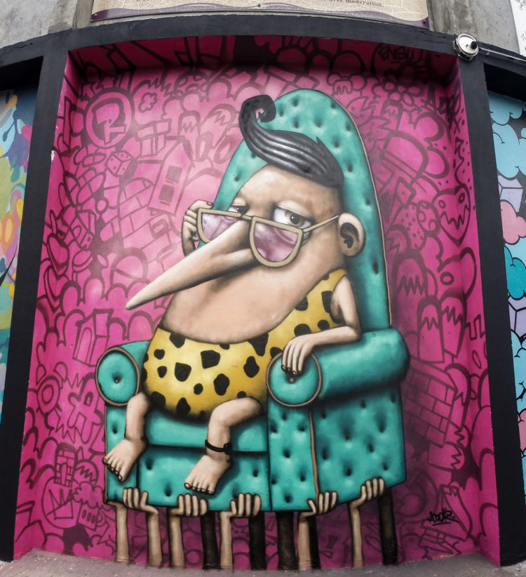 Ce jeune artiste qui a étudié les arts et a grandi dans le nord-ouest de la France est influencé par les graffeurs, les bandes dessinées et les dessins animés. Il a commencé à dessiner, peindre et collaborer avec des artistes de rue dès l’adolescence, créant son propre univers rempli de personnages imaginaires inspirés des contes de fées, de spectacles circassiens, de l’actualité, des caricatures… Il pulvérise aujourd’hui ses créations sur les murs de Montréal, Shanghai, Majorque, Manchester… ou Strasbourg !