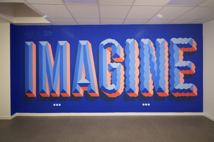 Cette œuvre intitulée ‘Imagine », un mot identique en anglais et en français, est une collaboration où Rachel et Christine ont fait évoluer les formes des lettres du début à la fin pour les rendre plus oniriques. À travers ce mot unique, elles souhaitent encourager les futurs étudiants de cette école à toujours voir plus loin et à être créatifs.